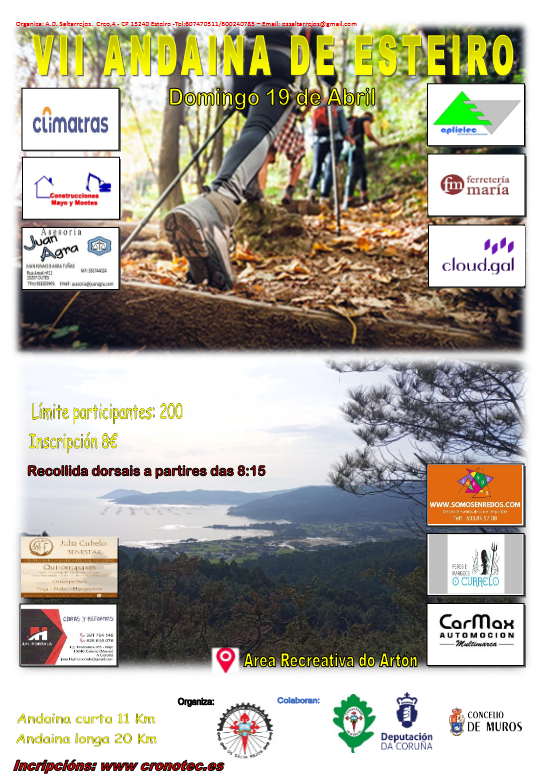 A “Asociación Os Salta Rejos”, organiza a “Andaina de Esteiro 2026” que se celebrará o día domingo 19 de abril de 2026, con saída e chegada na parque do Artón de Esteiro.