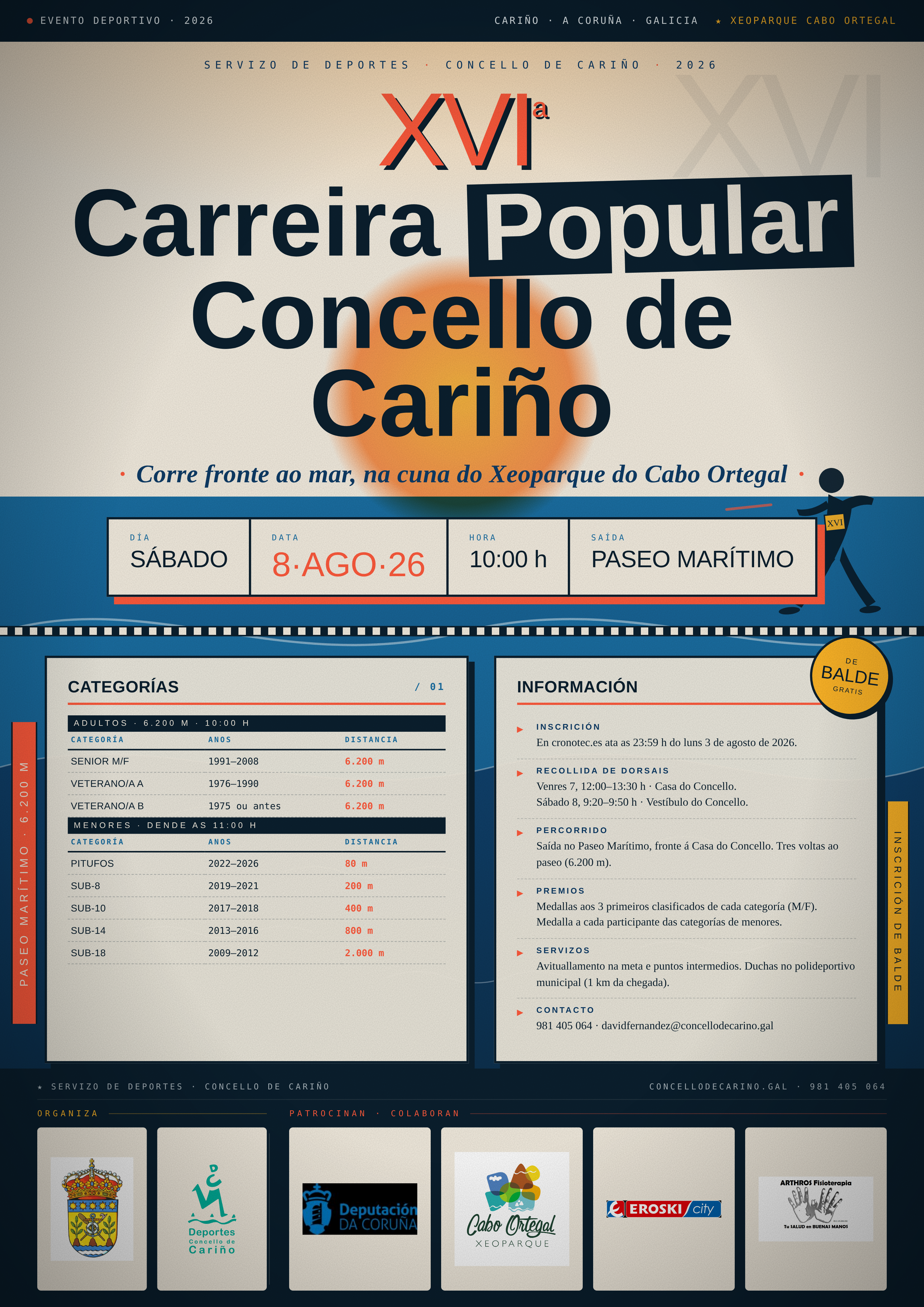 A proba denomínase XVI Carreira popular: Concello de Cariño está organizada polo Servizo de Deportes do Concello de Cariño e colaboran ou patrocinan esta proba: Eroski city, Arthros Fisioterapia e a Deputación da Coruña.